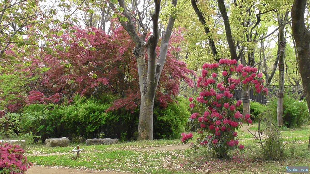シャクナゲ(右)に、ベニバナトキワマンサク(奥)です。